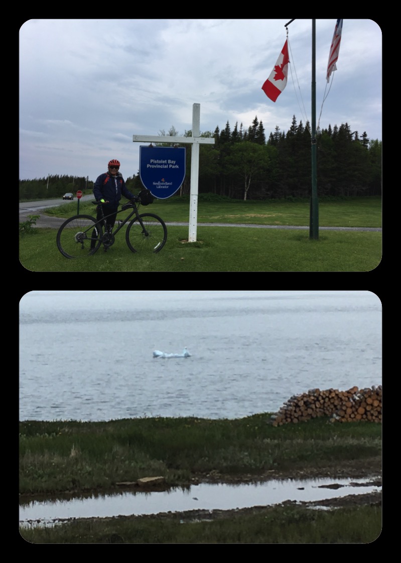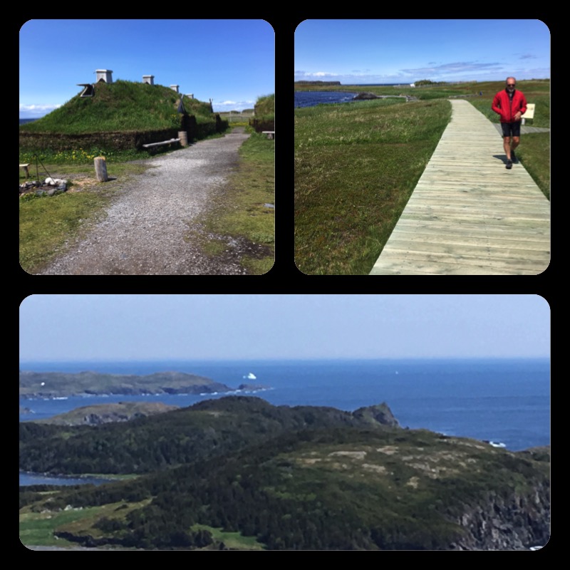 We got up to a warm sunny day. Today was to be the highlight of the tour, a visit to L'Anse aux Meadows, where Vikings from Greenland first visited North America 1,000 years ago. We would return to the same campsite so this was a ride out and back. On the way we stopped in the village of St. Lunaire and did a short steep hike to a hilltop with that expansive view of the eastern coast of the peninsula. From this spectacular place, we saw several icebergs as well as a moose. We later got a close-up view of one of these icebergs which was grounded in a small cove.