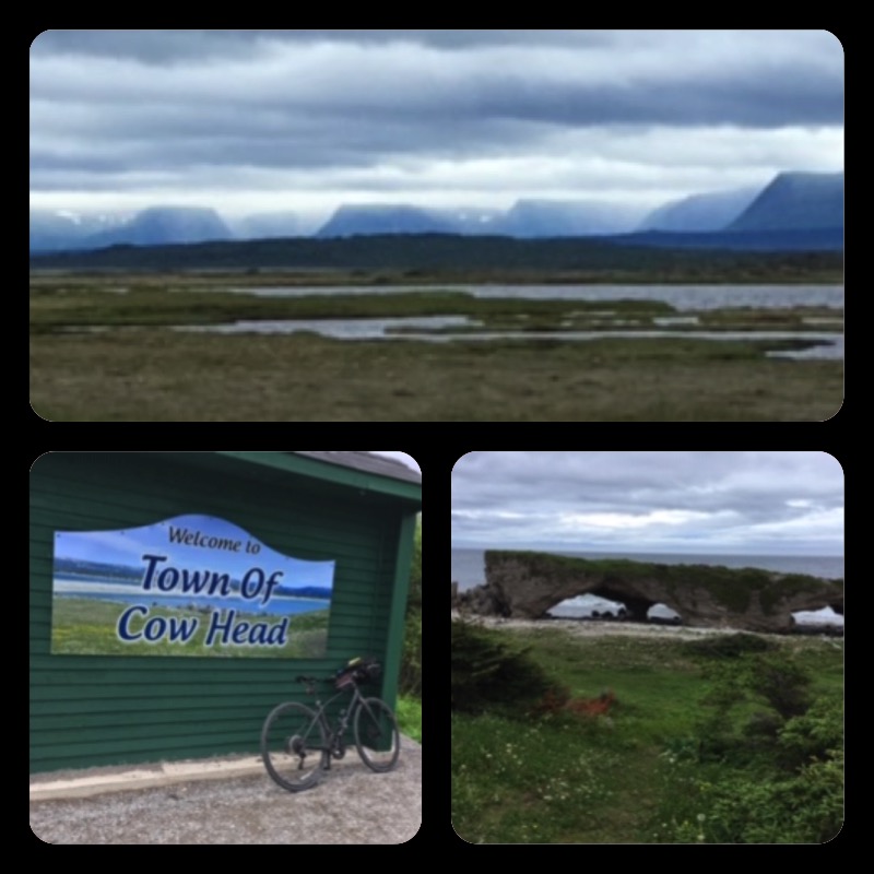 We are off. Today was a very intense day. It started with chilly rain as we climbed into Gros Morne National Park. We started and ended at sea level but in between ascended and descended 4000 feet passing through some strikingly scenic country. Gros Morne offers some of the world’s best illustrations of plate techtonics. Its rocks, once part of an ancient ocean, were thrust up by colliding continents, to become the northern most part of the Appalachian Mountain chain. Much later, glaciers carved this place into the spectacular landscape that I saw today. The last part of today’s ride crossed the Tablelands from Bonne Bay to the fishing village of Trout River. Tablelands is a mountain range of barren orange-brown rock, one of the world’s few examples of exposed material from the earth’s mantle.